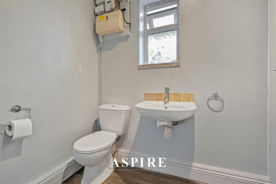 A spacious four-piece suite comprising a white panel bath, larger than average shower, wash hand basin and low-level WC. Part-tiled walls, tiled flooring, and obscure double glazed window.