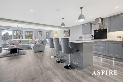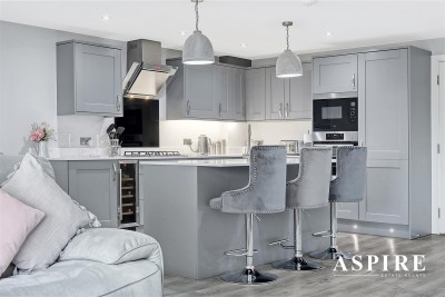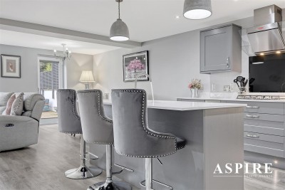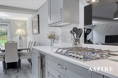 Open Plan Living Space/Kitchen - 7.80m x 5.99m (25'7 x 19'8) - Laminate floor with under floor heating , bi-folding doors and single door leading to the rear garden. Smooth ceilings with in set centre ceiling spotlights, pendant lighting, radiator, power points. The kitchen area comprises of fitted with high gloss soft close units to both eye and base level. Quartz worktops incorporating central island unit with storage below, and wine cooler. Inset sink unit, lighting above, Inset single oven with separate microwave above. Inset four ring gas hob , extractor fan above, Integrated dishwasher and fridge freezer.