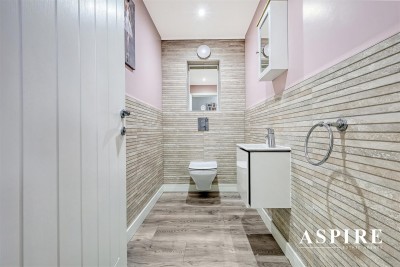 Downstairs Wc - Laminate flooring, fully tiled to one wall, Half tiled to remaining walls, Duravit suite comprising white wall hung basin with chrome mixer tap and wall mounted WC, Extractor fan, smooth ceilings with in set centre ceiling spotlight.
