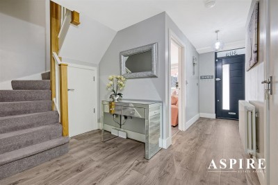 Main Hallway - Laminate floor, stairs to first floor with storage cupboard below, smooth ceilings with two pendant ceiling lights and power points.