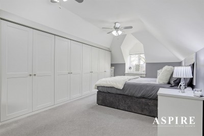 Bedroom One/Loft Room - 5.00m x 3.76m (16'5 x 12'4) - Carpet throughout, double glazed windows to rear, wall mounted radiator smooth plastered vaulted ceiling, with two fan ceiling lights, Eaves storage cupboard, bespoke fitted wardrobes, power points and door leading to: