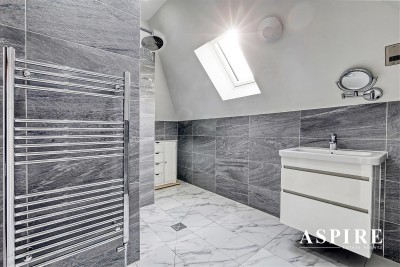 En-Suite Shower Room - Tiled floors throughout with tiled surrounds, Duravit contemporary three piece suite comprising double fully tiled shower enclosure with rain fall shower head and hand held mixer tap, vanity sink unit. wall mounted WC, shaver point., wall mounted heated towel rail, smooth ceilings with in set centre ceiling spotlights and extractor.