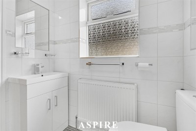 W/C - Fitted with a two piece suite comprising a low level WC and wall mounted wash basin with tiled splashback. Additional features include an obscured window to the rear, vinyl flooring, wall mounted radiator and smooth plastered ceiling.